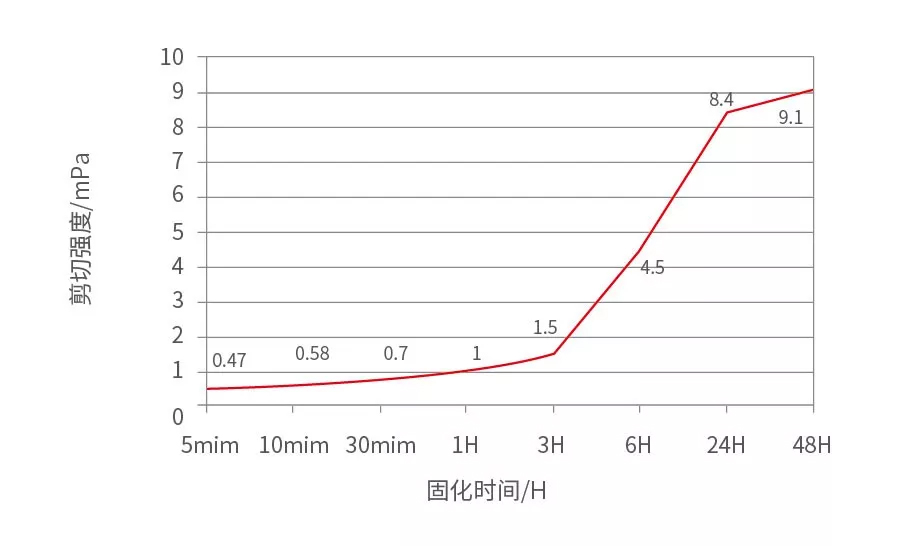 下圖為固化強(qiáng)度隨時間變化曲線(材料:PC/PC 條件:25℃@60%RH)